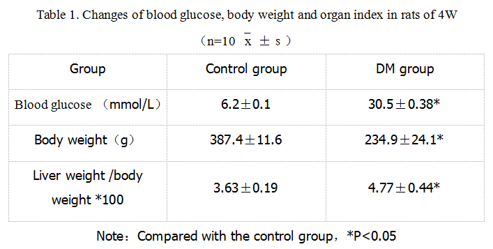 1. 大体观察:正常组大鼠体型适中,精神状态良好,动作自如,反应灵敏,毛发平伏有光泽。而糖尿病大鼠体重变轻,精神萎靡,反应迟钝,毛竖无光泽,动作迟缓,弓背捲体,尿量显著增加。糖尿病大鼠较正常组体重显著减轻,心脏系数、肝脏系数较正常组有显著增加,且有统计学意义。